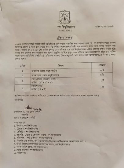 গণ বিশ্ববিদ্যালয়ের রসায়ন বিভাগের আসবাবপত্র সরবরাহ প্রসঙ্গে।